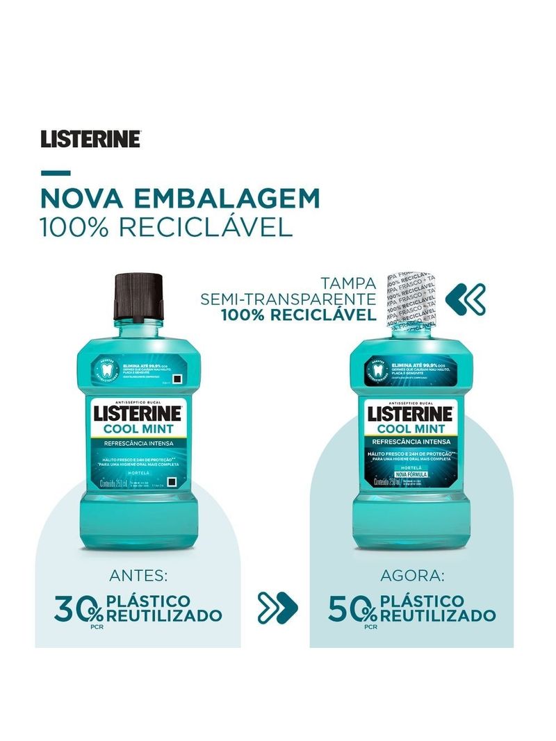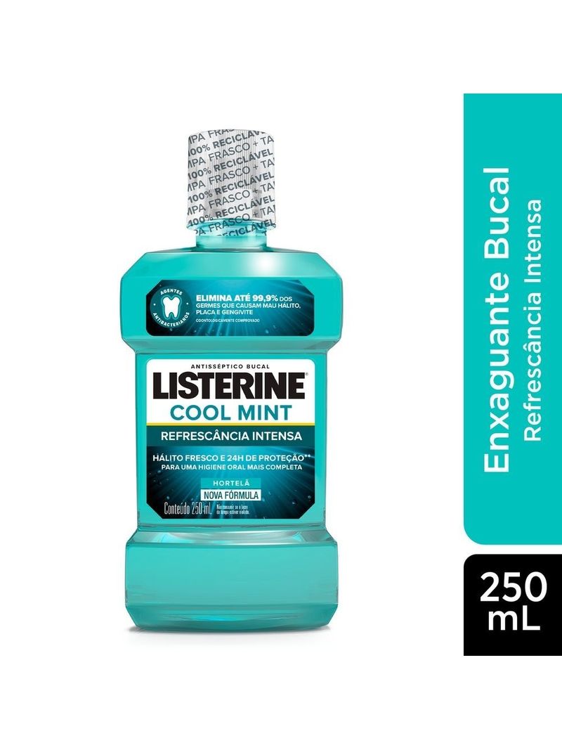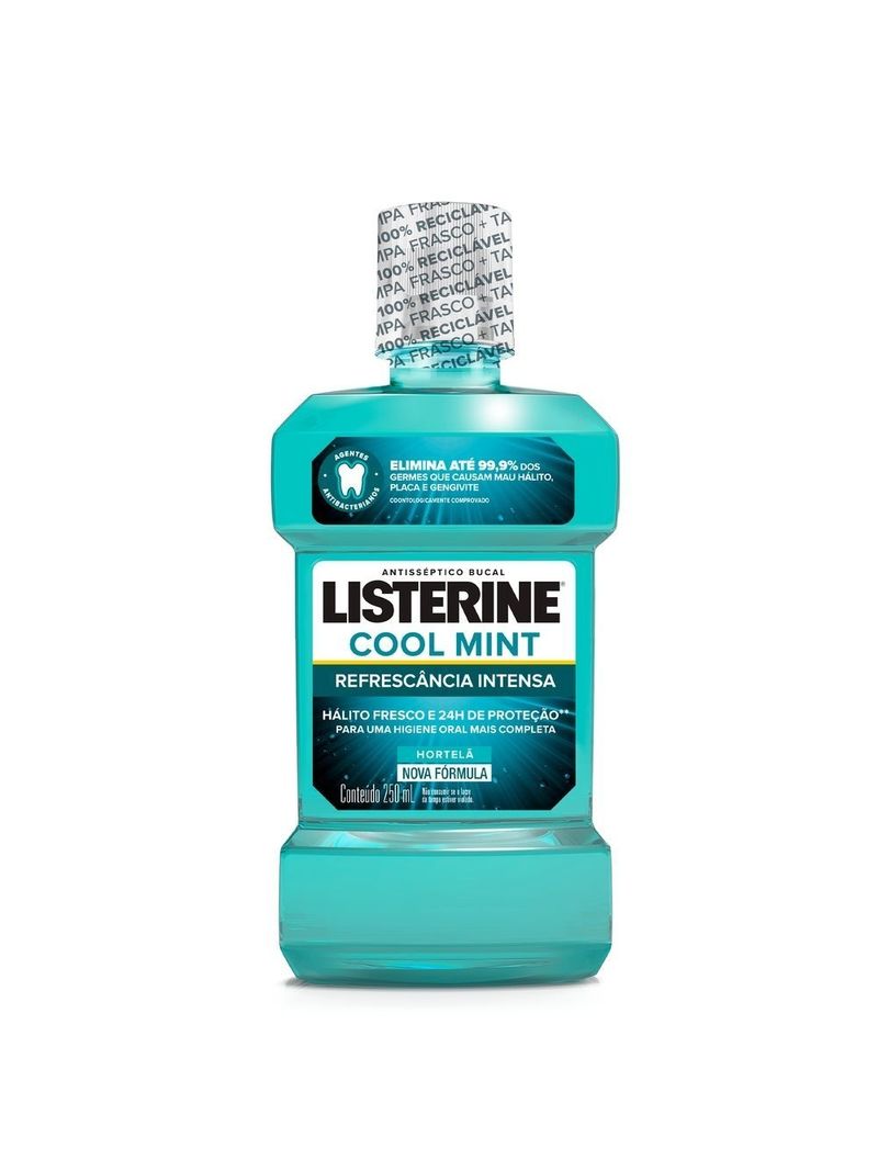 Você sabia que os dentes são apenas 25% da sua boca? Por isso, apenas a escovação não garante uma limpeza completa. Adicione LISTERINE® Cool Mint Enxaguante Bucal, 250mL à sua rotina e limpe aonde a escova não alcança, eliminando até 99% dos germes* causadores de mau hálito, placa bacteriana e gengivite. Inclua LISTERINE® e limpe até 100% da sua boca.