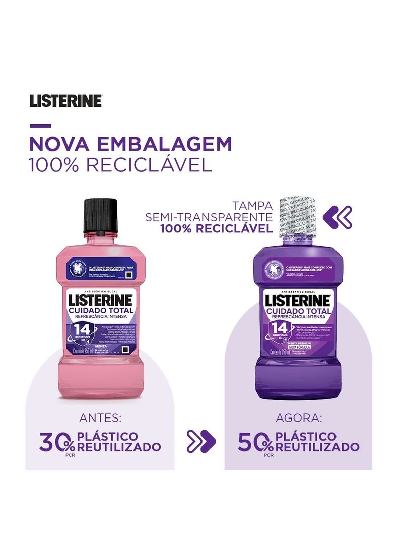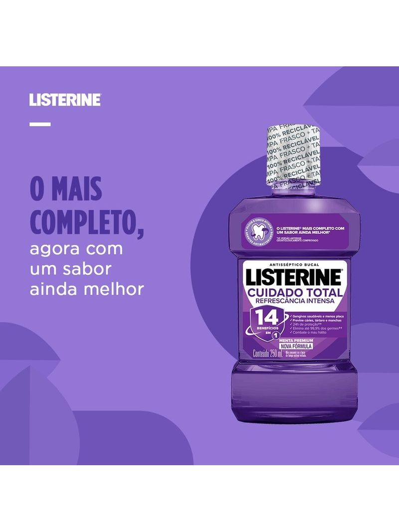 Você sabia que os dentes são apenas 25% da sua boca? Por isso, apenas a escovação não garante uma limpeza completa. Adicione LISTERINE® Cuidado Total 14 Benefícios em 1 Enxaguante Bucal, 250mL à sua rotina e limpe aonde a escova não alcança, eliminando até 99, 9% dos germes* causadores de mau hálito, placa bacteriana e gengivite,e também prevenindo contra cárie e tártaro. Proporcionando dentes e boca mais saudáveis! Inclua LISTERINE® e limpe até 100% da sua boca.