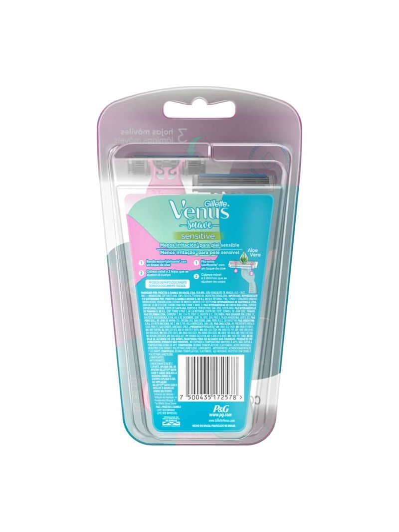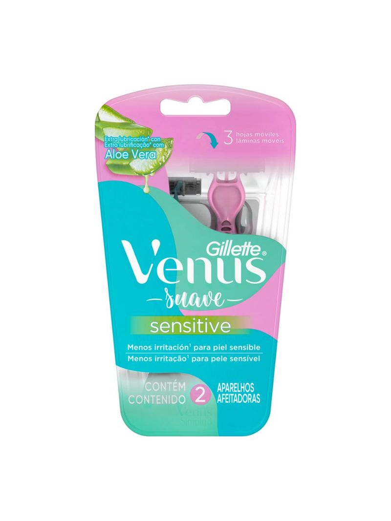 Os Aparelhos de Depilação Descartáveis Venus Suave Sensitive possuem fita lubrificante com tecnologia Skin Elixir para facilitar o deslizamento e ajudá-la a ter uma depilação suave com menos irritação, ideal para peles sensíveis. Sua cabeça móvel se ajusta a suas curvas e suas três lâminas proporcionarão uma depilação rente e maciez por mais tempo. Venus Suave Sensitive é dermatologicamente testada para peles sensíveis. Para uma experiência incrível, use o Gel para Depilação Gillette Satin Care.