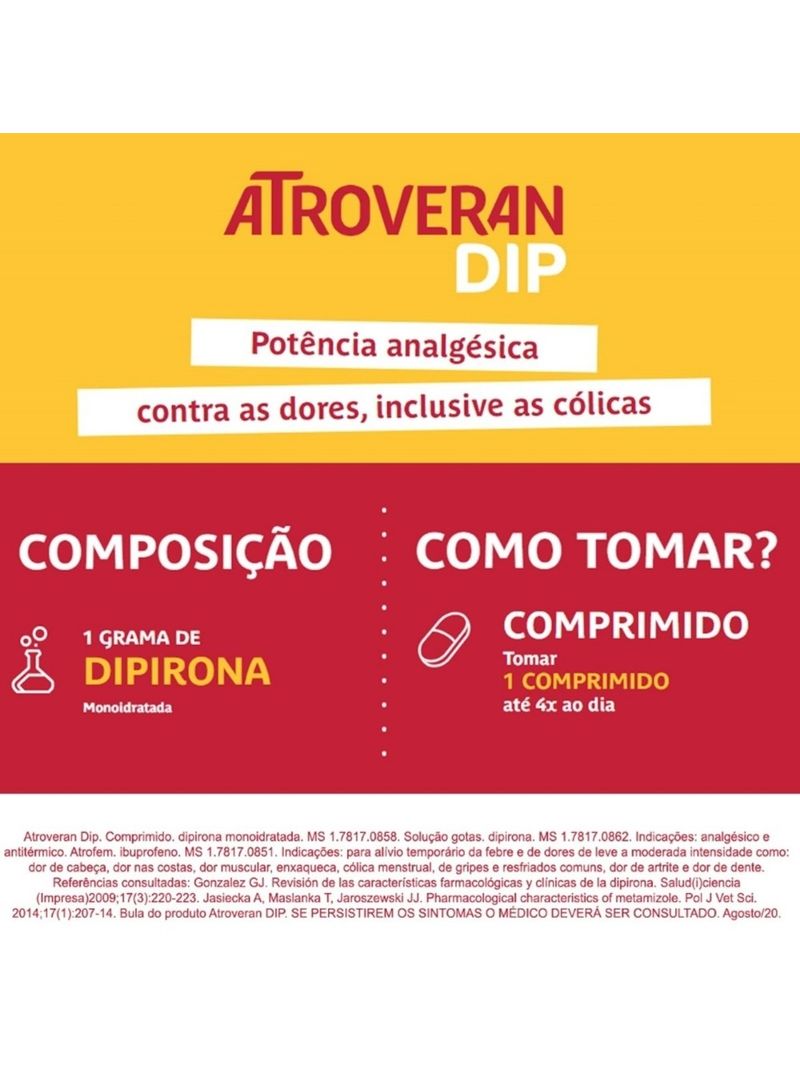 Atroveran Dip é um potente analgésico contra as dores e cólicas do período menstrual, e possui 1g de Dipirona em sua formulação.