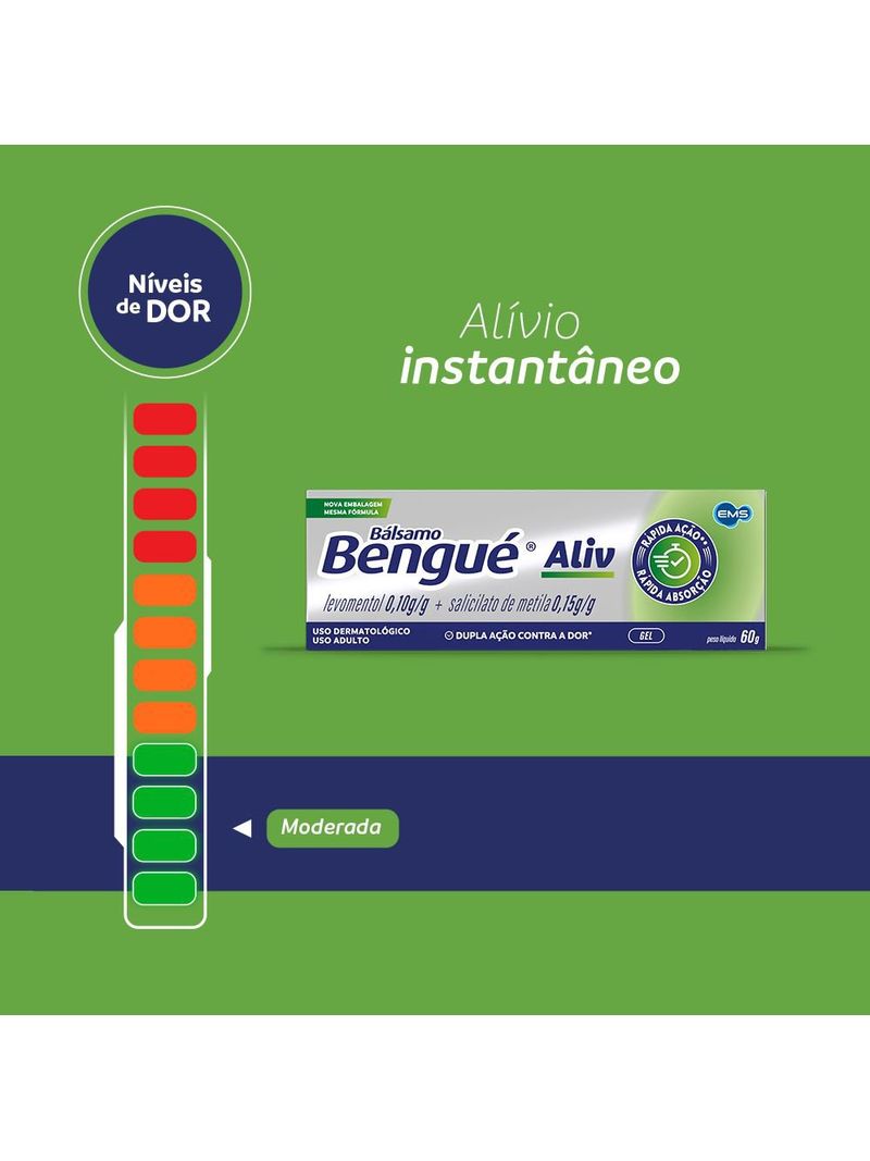 Bálsamo Bengué Aliv é um analgésico tópico que proporciona alívio contra dores moderadas, inclusive aquelas causadas pelas atividades e ações do dia a dia. Com rápida absorção e alívio imediato, Bengué Aliv oferece dupla ação contra a dor: