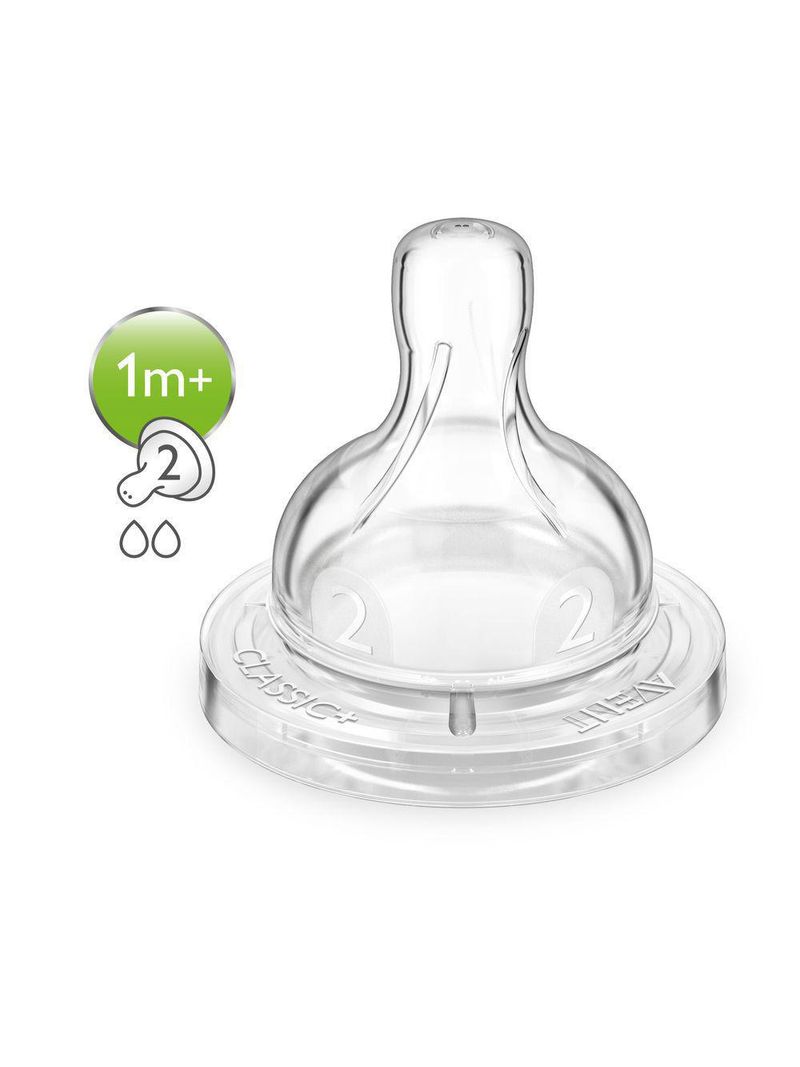 Bicos Anti-colic Avent, bicos em silicone macio que não pega cor e nem cheiro, compatíveis com as mamadeiras Classic+ e Anti-colic, exclusivo sistema anticólica, indicado para bebês de 1a 3 meses, contém 2 unidades, isento de BPA.
