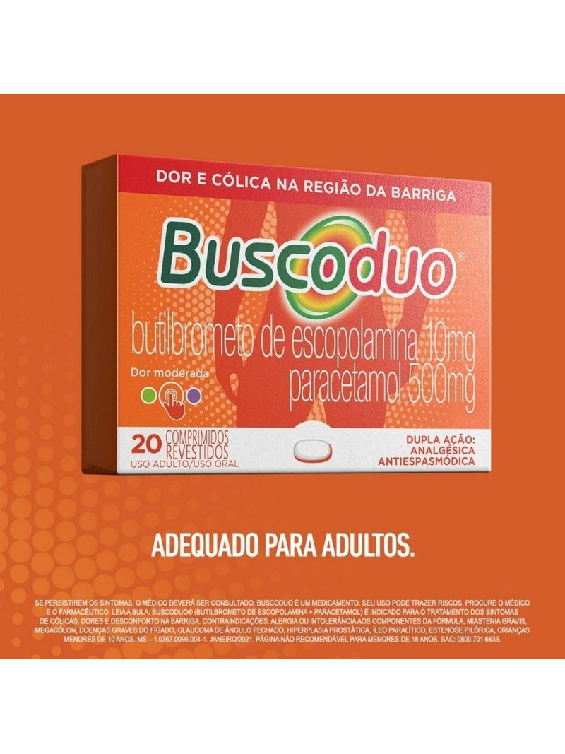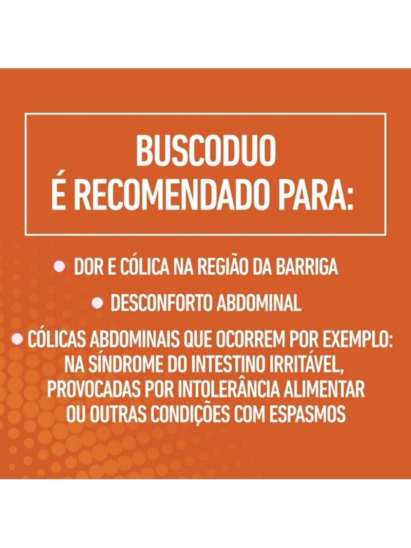 Buscoduo é um medicamento analgésico e antiespasmódico para o alívio rápido e prolongado da dor moderada e cólica na região da barriga.