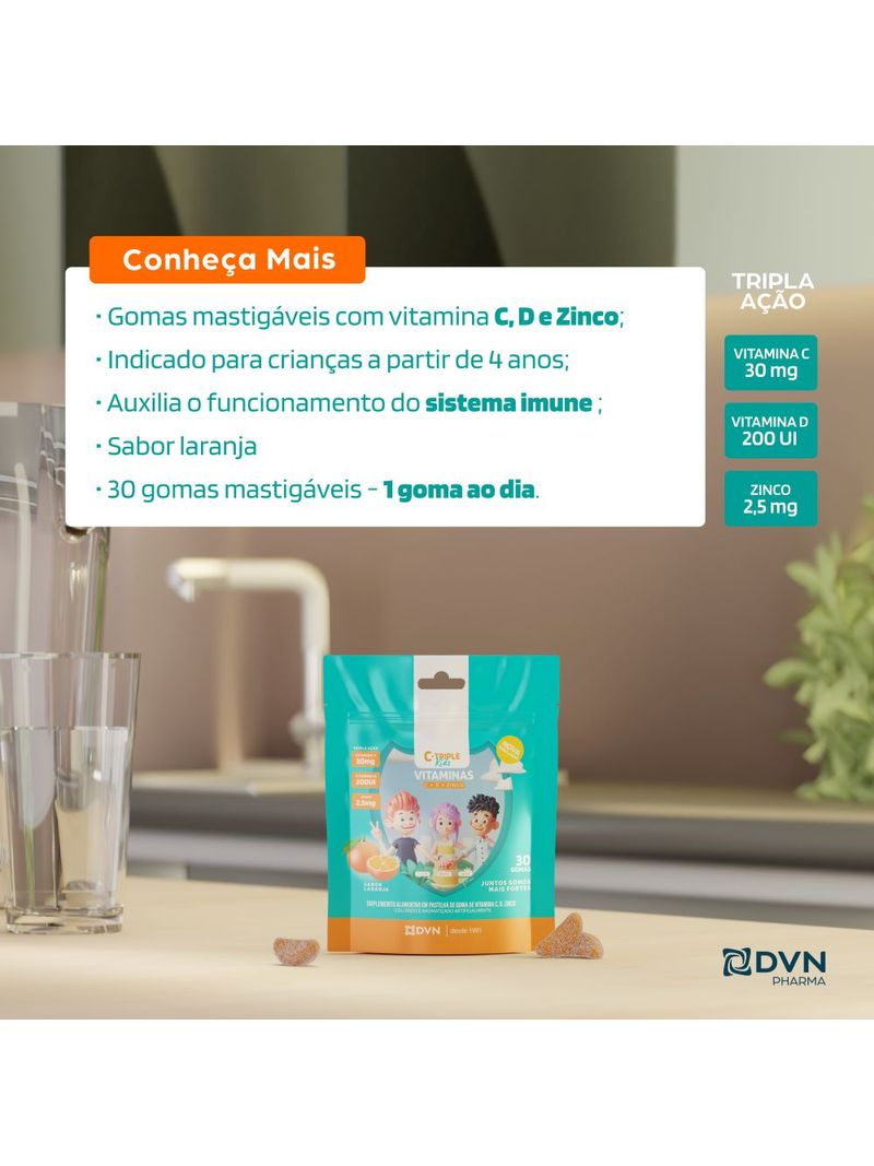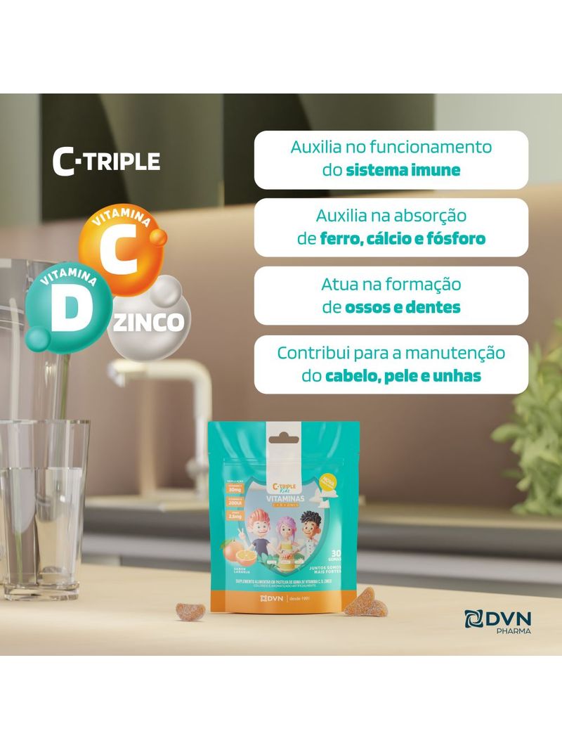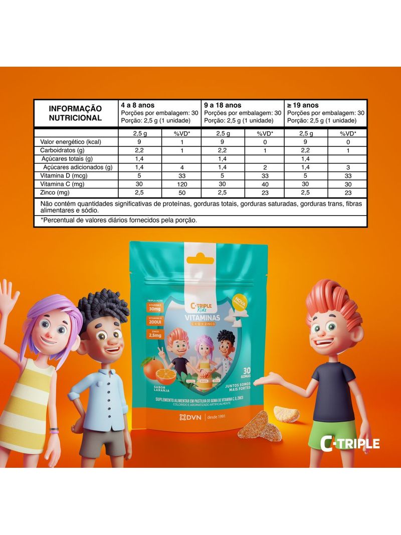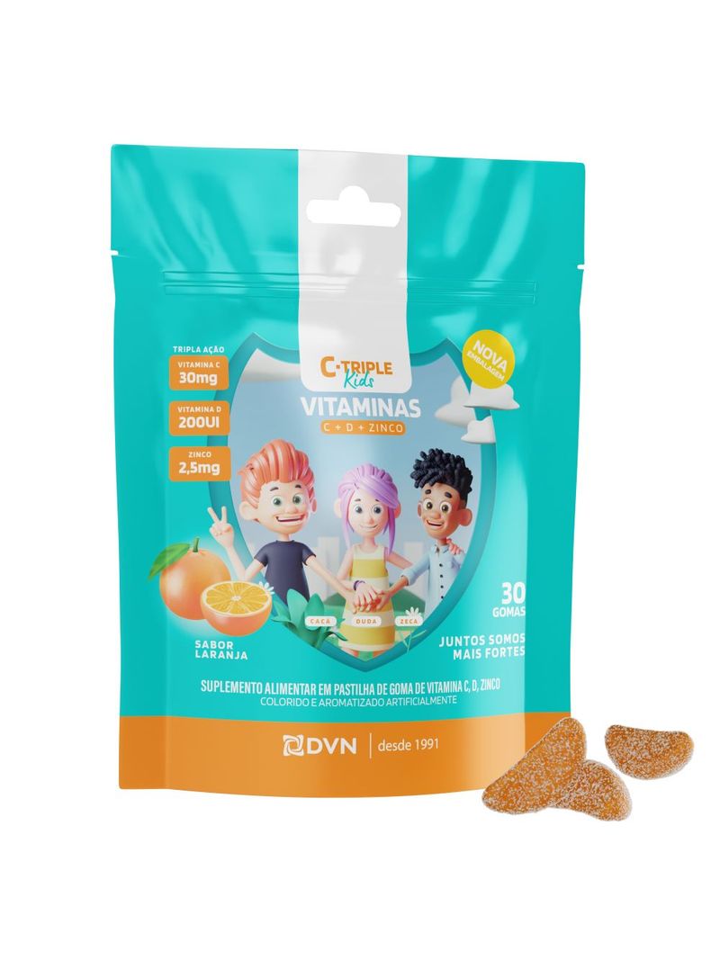 C-Triple Kids oferece tripla proteção para as crianças se divertirem como merecem! É o suplemento de Vitamina C, Vitamina D e Zinco indicado para os pequenos a partir de 4 anos de idade em formato de gominhas com delicioso sabor laranja.