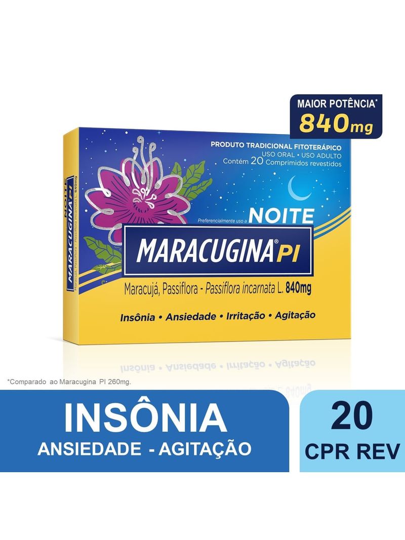 Maracugina PI Noite é indicado para o tratamento da ansiedade leve, como estados de irritabilidade, agitação nervosa, tratamento de insônia e desordens da ansiedade. Maracugina PI Noite contém a maior concentração de Passiflora Incarnata do mercado (840mg), proporcionando maior relaxamento e eficácia contra os sintomas do estresse que causam insônia e má qualidade do sono.