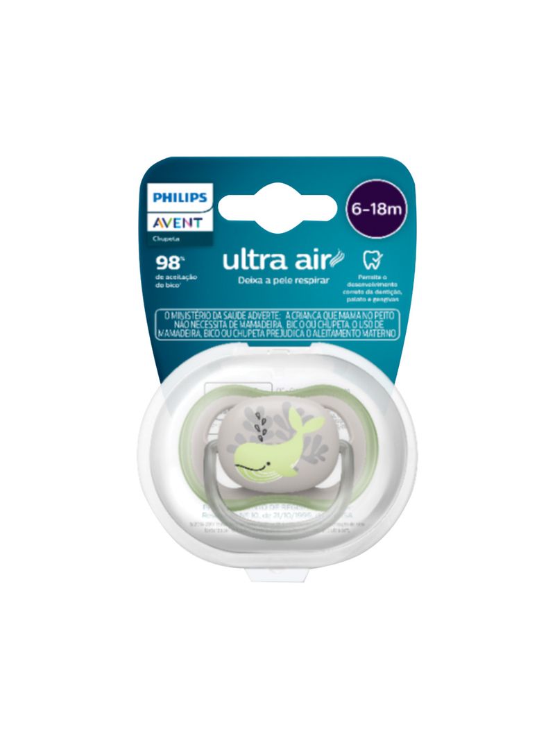 Chupeta com ventilação. A chupeta Philips Avent Ultra Air tem orifícios para passagem de ar extragrandes para manter a pele do seu bebê seca.