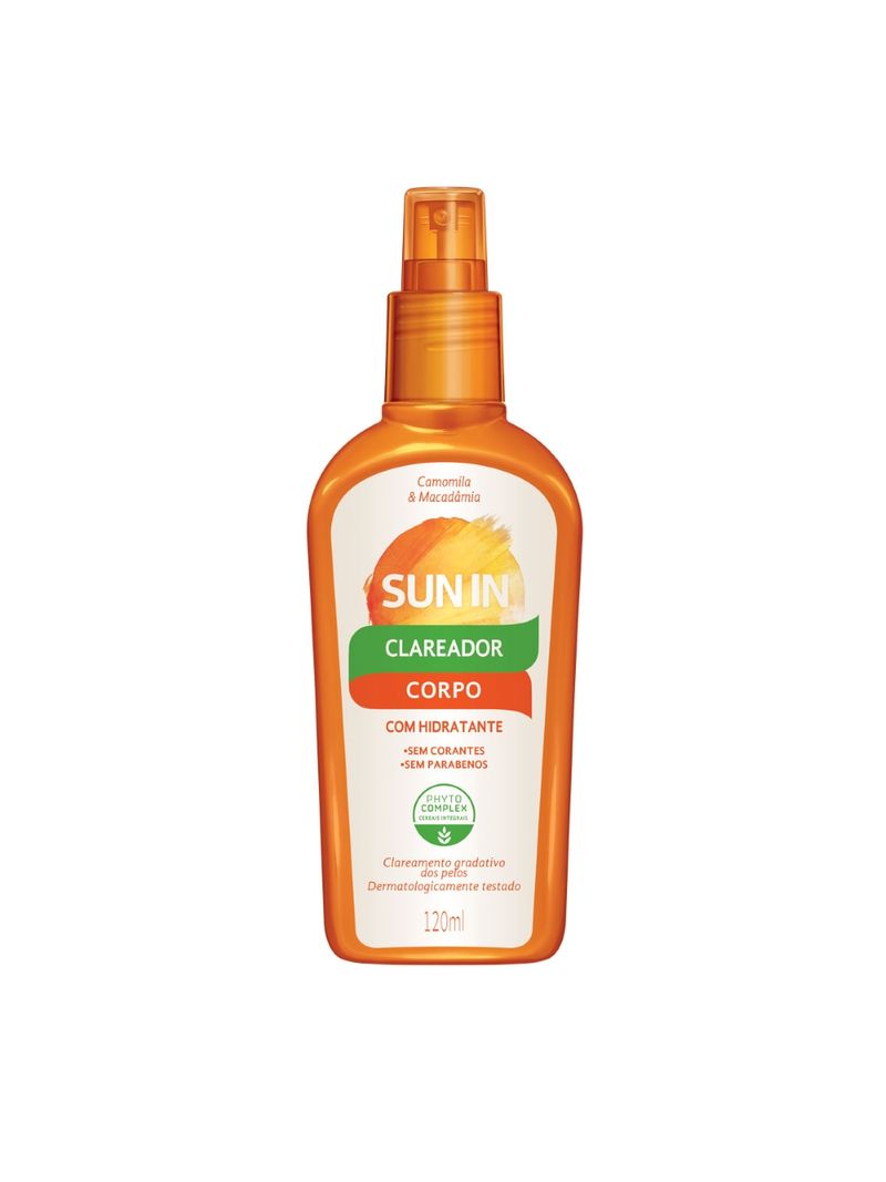 OSun In da Phytoervasé um clareador que permite descolorir os pelos do corpo. Ao expor a pele com o produto aplicado ao sol ou calor do secador, conseguimos uma tonalidade mais clara. O efeito é gradual, permitindo assim um controle do tom desejado. O Sun In tem ação condicionadora, é enriquecido com extrato de camomila e óleo de Macadâmia que ajuda a proteger os fios enquanto clareia. Sua nova fórmula é mais potente e defácil aplicação com spray.