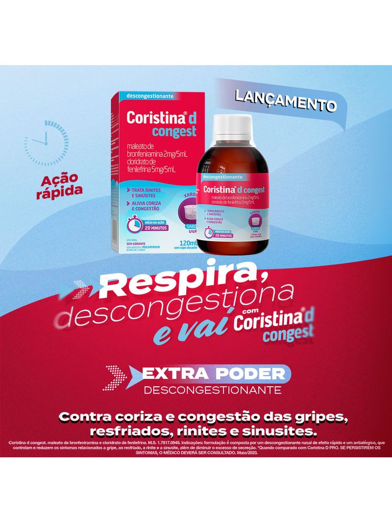 INDICAÇÃO: Coristina® D Congest é um medicamento indicado para adultos e crianças acima de 2 anos, cuja formulação é composta por um descongestionante (desentupimento) nasal de efeito rápido e um antialérgico, que controlam e reduzem os sintomas relacionados a gripe, ao resfriado, a rinite e a sinusite (doença que afeta as cavidades existentes ao redor do nariz) (alérgicas ou não), além de diminuir o excesso de secreção (coriza)