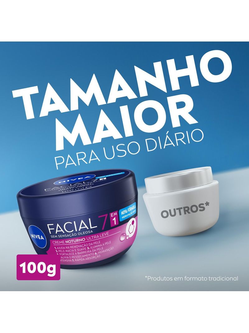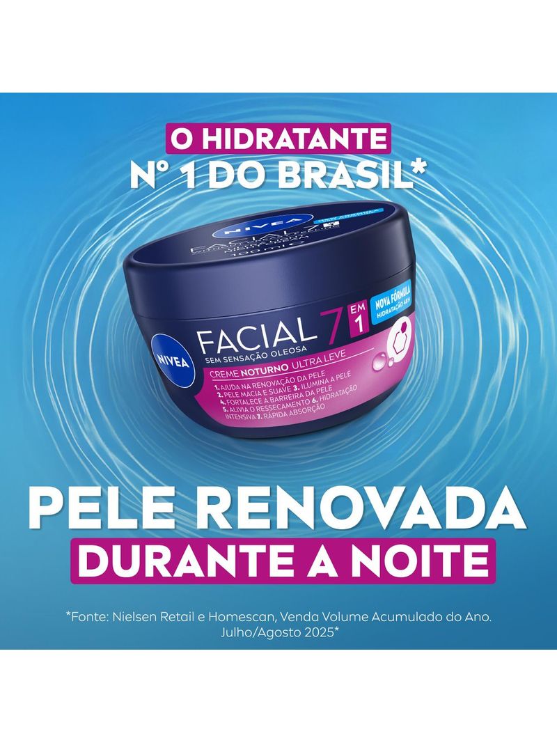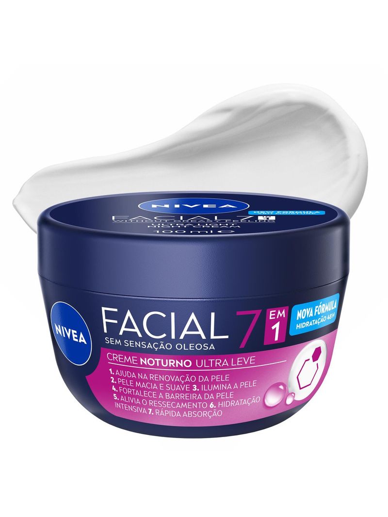 O Creme Facial Nivea Noturno é ideal para cuidar da sua pele enquanto você dorme, com uma fórmula suave nutre e hidrata intensamente a pele, sem deixar a pele com aspecto oleoso. Sua textura leve e de rápida absorção, contém Vitamina B5 que aumenta significativamente os níveis de glutationa nas células, atuando como um potente antioxidante na pele auxiliando a renovação celular.