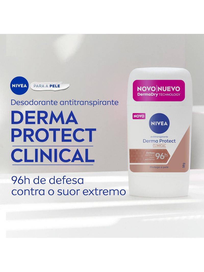 O Nivea Derma Protect Clinical é um desodorante stick que promove máxima proteção contra o suor e mau odor por até 96 horas, garantindo eficácia elevada sem agredir ou manchar a sua axila.