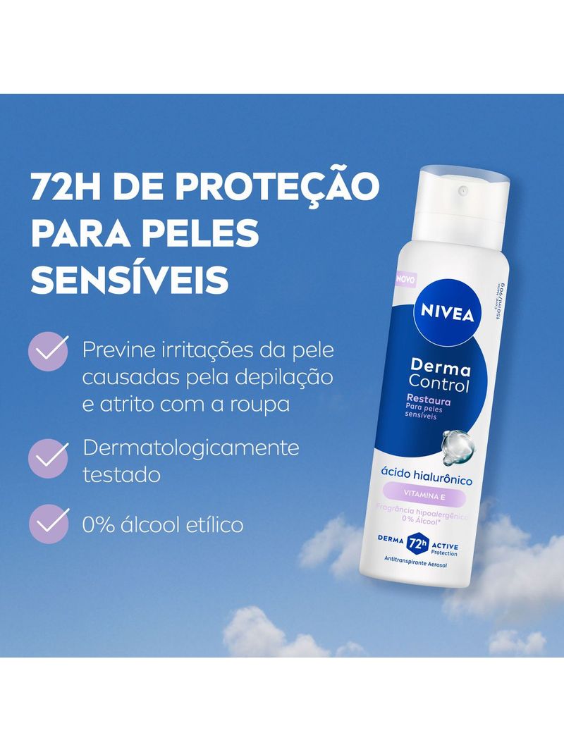 NIVEA Desodorante Aerossol Derma Control Restaura é um antitranspirante desenvolvido para oferecer proteção intensa contra o suor e o mau odor, cuidando da pele sensível das axilas com uma fórmula especial que inclui Ácido Hialurônico e Vitamina E.