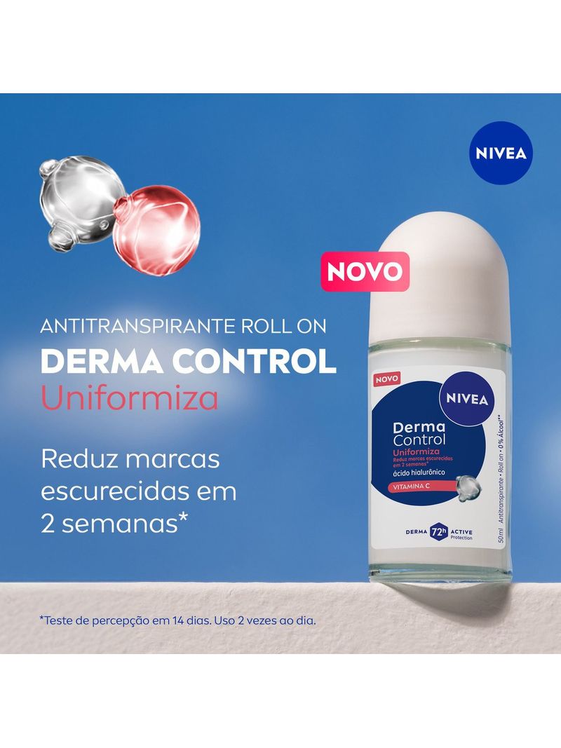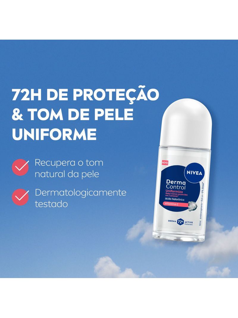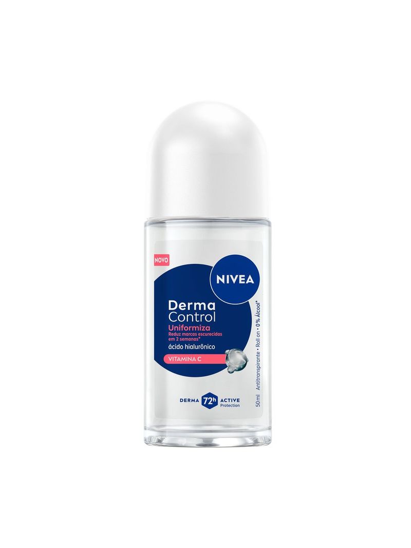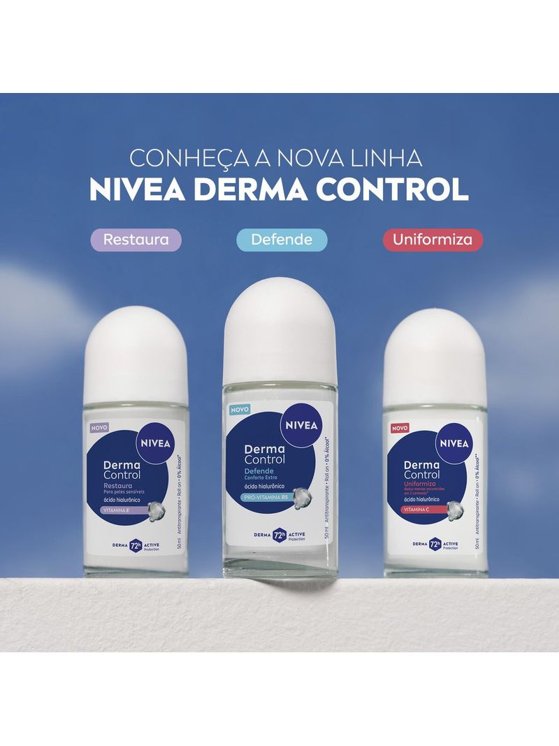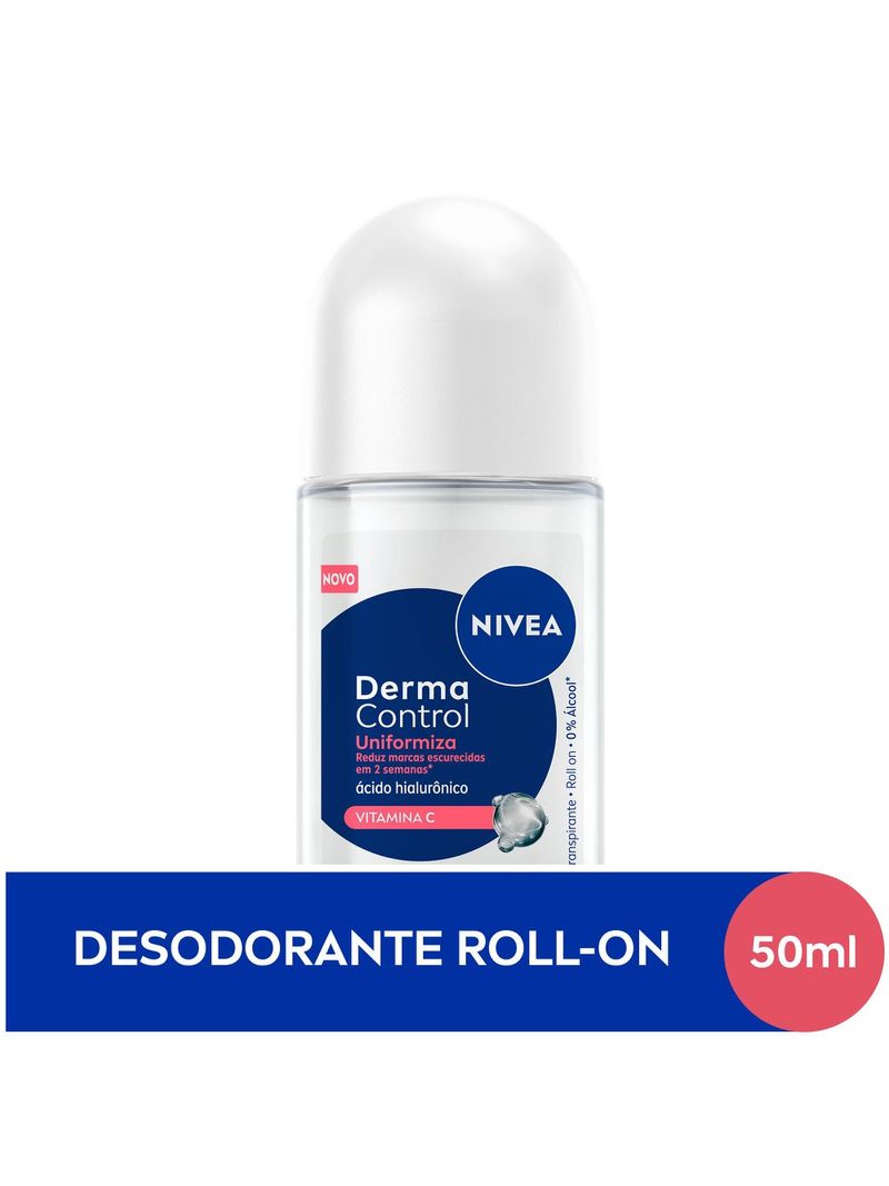 NIVEA Desodorante Roll-On Derma Control Uniformiza Ć© um antitranspirante desenvolvido para oferecer proteção intensa contra o suor e o mau odor, cuidando da pele das axilas com uma fórmula especial que inclui Ćcido HialurĆ“nico e Vitamina C.