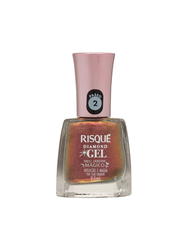 O Top Coat Fixador Intuição e Magia Risqué Diamond Gel promove um efeito gel com partículas de brilho em dourado e rose gold, que transformam suas unhas em um espetáculo encantador! Desenvolvido especialmente para proporcionar durabilidade, conta com um pincel de 880 cerdas, que além de facilitar a esmaltação, proporciona aplicação uniforme.