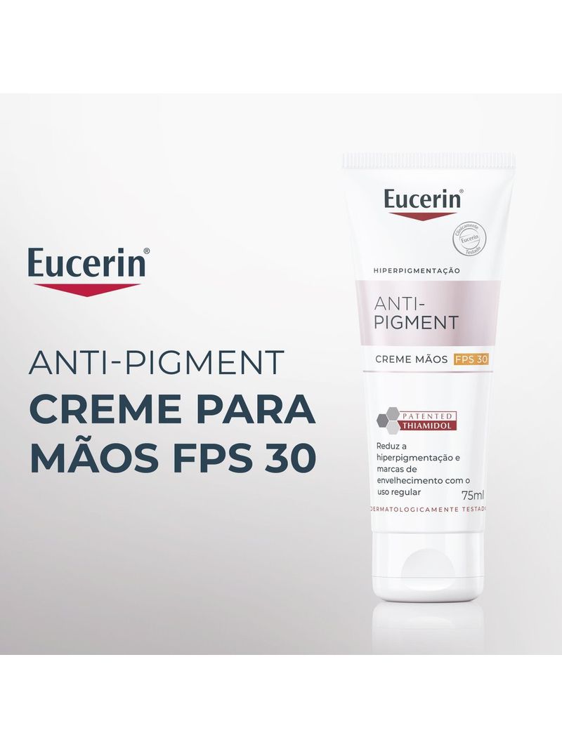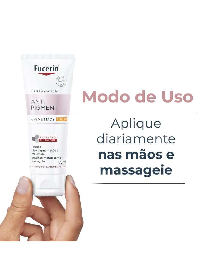 O creme clareador para mãos Eucerin Anti-Pigment é um produto indicado para reduzir a hiperpigmentação e os sinais do envelhecimento. Ele contém o ativo revolucionário patenteado Thiamidol em sua composição que garante uma sensação confortável de pele nutrida durante todo o dia.