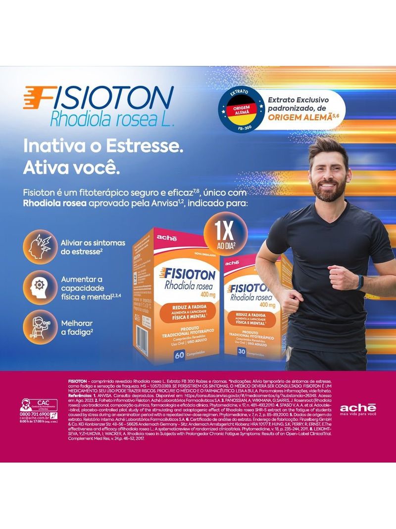 Fisioton é um medicamento de origem vegetal derivado do extrato da planta Rhodiola rosea L, obtido através de um rigoroso método de cultivo e extração, garantindo sua qualidade e a ausência de substâncias tóxicas na sua composição. É tradicionalmente utilizado com o objetivo de reduzir a fadiga e contribuir para o aumento da capacidade de trabalho físico e mental, proporcionando um melhor equilíbrio do organismo para se adequar às situações que acarretam maior desgaste tais como, exercícios físicos intensos, sobrecarga de trabalho, atividade mental excessiva e trabalho em períodos noturnos, adequando o nível de resposta do organismo a esses fatores. Seu uso é contraindicado para menores de 12 anos de idade, portadores de doenças cardíacas ou que estejam em uso de medicamentos para o tratamento de distúrbios psiquiátricos ou cardiovasculares.