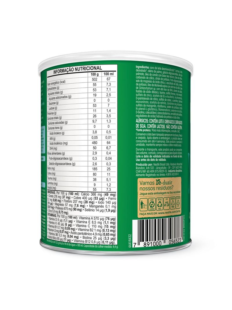 Soro de leite desmineralizado*, lactose, leite desnatado*, oleína de palma, galacto-oligossacarídeo, óleo de palmiste, óleo de canola com baixo teor erúcico, óleo de milho, carbonato de cálcio, citrato de potássio, fruto-oligossacarídeo, fosfato de sódio dibásico, fosfato de potássio dibásico, L-ascorbato de sódio, óleo de mortierella alpina com alto teor de ARA, sais de magnésio de ácido cítrico, óleo de schizochytrium sp. com alto teor de DHA, cloreto de magnésio, cloreto de potássio, cloreto de sódio, sulfato ferroso, sulfato de zinco, acetato de DL-a-tocoferila, D-pantotenato de cálcio, nicotinamida, sulfato de cobre, tiamina mononitrato, acetato de retinila, cloridrato de piridoxina, riboflavina, ácido N-pteroil-L-glutâmico, iodeto de potássio, fitomenadiona, D-biotina, selenato de sódio, colecalciferol, cianocobalamina, emulsificante lecitina e reguladores de acidez hidróxido de potássio e ácido cítrico. *Fonte proteica.