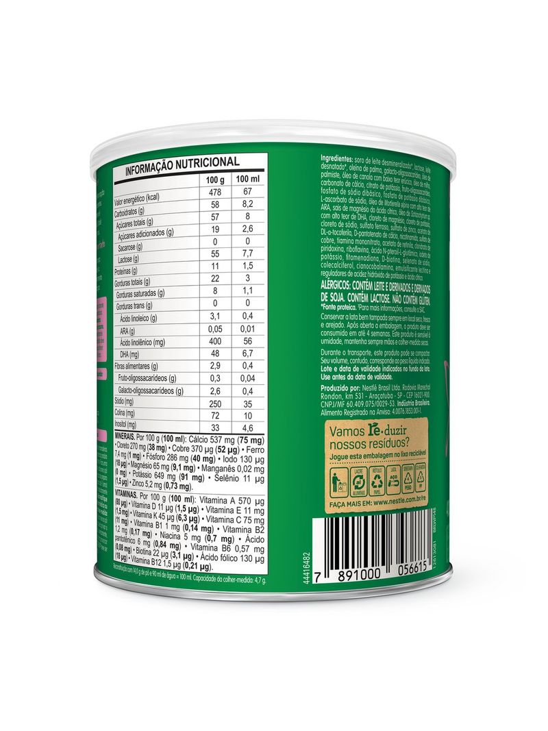 Soro de leite desmineralizado*, lactose, leite desnatado*, oleína de palma, galacto-oligossacarídeo, óleo de palmiste, óleo de canola com baixo teor erúcico, óleo de milho, carbonato de cálcio, citrato de potássio, fruto-oligossacarídeo, fosfato de sódio dibásico, fosfato de potássio dibásico, L-ascorbato de sódio, óleo de mortierella alpina com alto teor de ARA, sais de magnésio de ácido cítrico, óleo de schizochytrium sp. com alto teor de DHA, cloreto de magnésio, cloreto de potássio, cloreto de sódio, sulfato ferroso, sulfato de zinco, acetato de DL-a-tocoferila, D-pantotenato de cálcio, nicotinamida, sulfato de cobre, tiamina mononitrato, acetato de retinila, cloridrato de piridoxina, riboflavina, ácido N-pteroil-L-glutâmico, iodeto de potássio, fitomenadiona, D-biotina, selenato de sódio, colecalciferol, cianocobalamina, emulsificante lecitina e reguladores de acidez hidróxido de potássio e ácido cítrico. *Fonte proteica.
