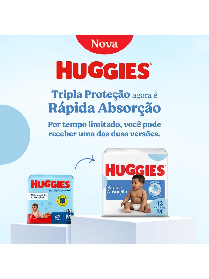 A Fralda Descartável Huggies Rápida Absorção oferece cuidado especial desde os primeiros dias de vida. Tripla proteção agora é Rápida Absorção: com novo sistema de absorção em segundos. Com absorção especial para coco líquido, cintura confortável e toque suave.