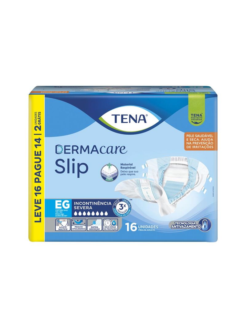 A Fralda TENA Dermacare EG foi desenvolvida para oferecer máxima proteção, conforto e cuidado com a pele, ideal para pessoas com incontinência urinária moderada a intensa. Possui camada respirável que permite a ventilação da pele, núcleo superabsorvente para rápida absorção e barreiras antivazamento que garantem mais segurança. O indicador de umidade facilita a troca no momento certo, proporcionando praticidade para cuidadores e bem-estar para o usuário. Seu formato anatômico e fita adesiva reposicionável oferecem ajuste seguro e confortável.