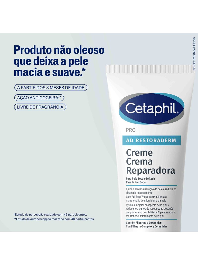 Cetaphil PRO AD Restoraderm Creme Hidratante é clinicamente comprovado para iniciar significativamente a reparação da barreira da pele em 24 horas e ajuda a aliviar a pele seca e com coceira após apenas 1 uso. Este creme exclusivo é formulado com ceramidas e AD-Resyl, que é especificamente projetado para ajudar a restaurar a barreira cutânea danificada, enquanto a tecnologia patenteada de Filagrina retém a hidratação e ajuda a fortalecer a pele contra agentes irritantes ambientais. Livre de parabenos e fragrâncias, este creme reparador suave foi testado por dermatologistas para ser adequado para peles sensíveis e propensas a eczema.
