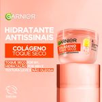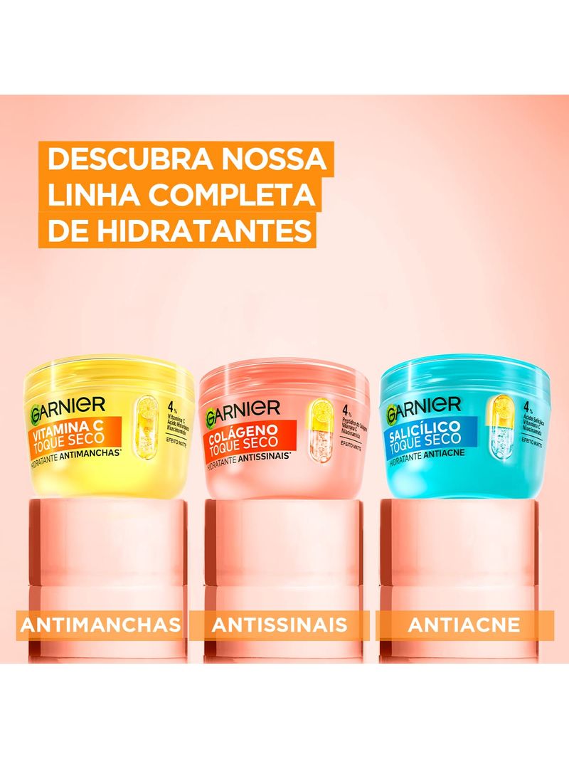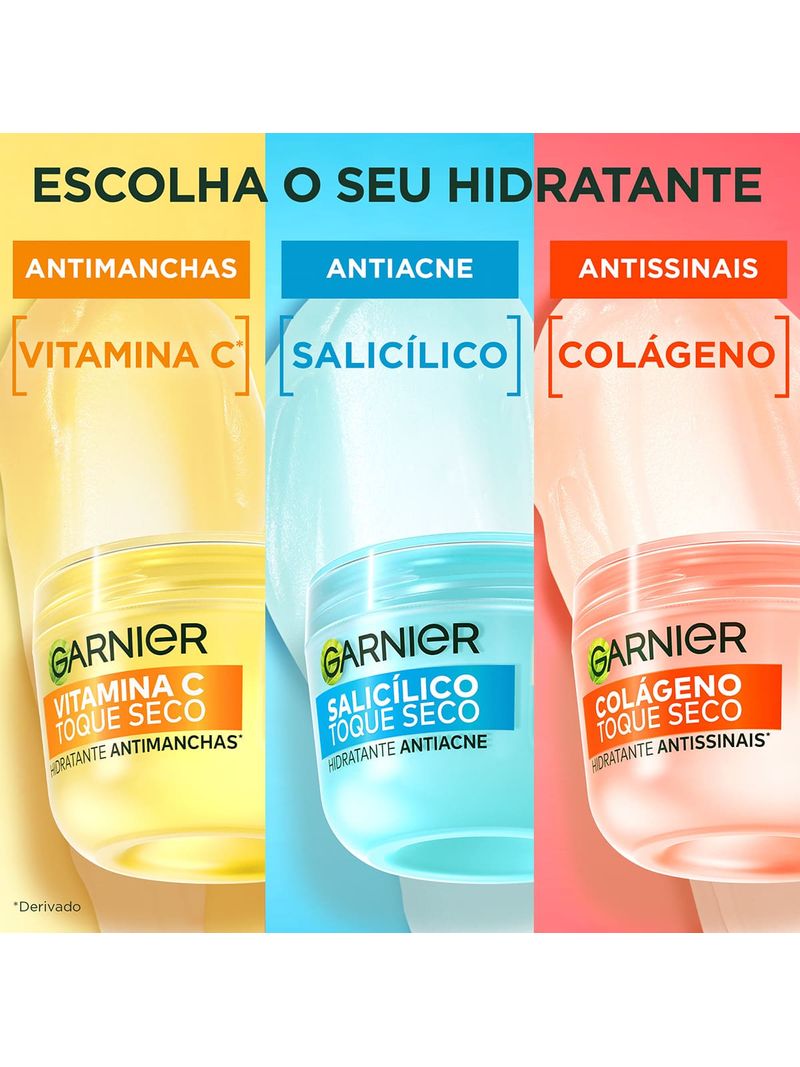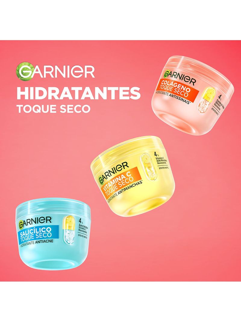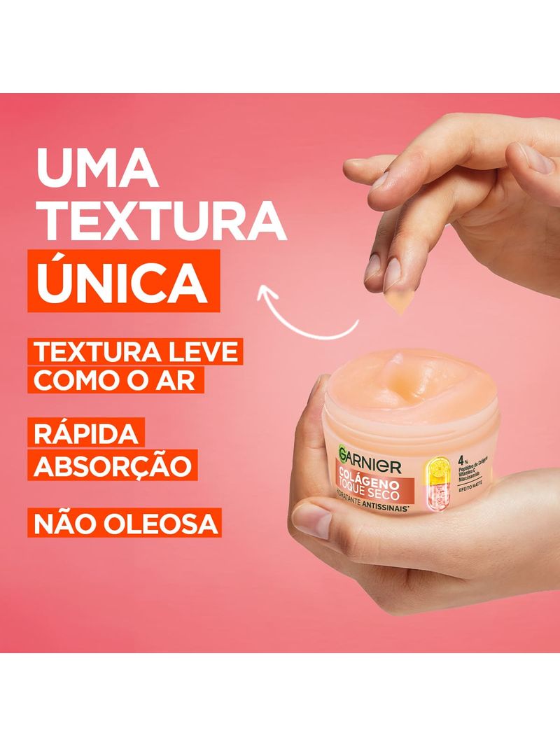 Garnier Hidratante Colágeno Toque Seco é um hidratante facial numa textura revolucionária para peles mistas e oleosas. Hidrata e reduz a oleosidade com 8h de toque seco. Com colágeno, niacinamida e vitamina C, o novo Hidratante Toque Seco Antissinais aumenta a firmeza e a elasticidade da pele, uniformiza, controla a oleosidade, além de hidratar sem pesar. Com resultados comprovados pelas consumidoras, onde 90% disse ser a melhor textura hidratante que já experimentou, 85% sentiram mais firmeza na pele e 83% sentiram minimizar as linhas de expressão, o Hidratante Toque Seco Antissinais possui textura que não é gel, não é creme, não pesa, só experimentando para sentir! Pode ser usado diariamente na sua rotina de skincare e em todos os tipos de pele, em especial as peles mistas e oleosas.