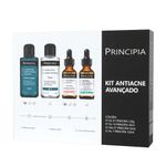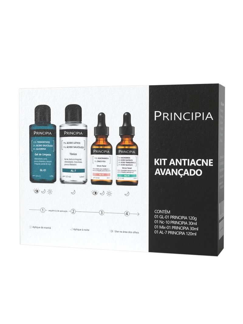 Kit anti-acne avançado com 4 produtos: um gel de limpeza com mix de tensoativos + salicílico + glicerina, um sérum com mix de 4 ativos sendo eles niacinamida, ácido glicólico, ácido tranexâmico e ácido salicílico, um sérum de composição de niacinamida + zinco pca e um tônico de ácido lático + ácido salicílico.