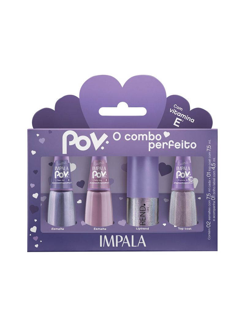 Estilo completo em um só kit. Aqui você encontra 2 esmaltes Impala POV, com acabamento de alta cobertura, 1 Top Coat, que potencializa o brilho e protege a esmaltação, e 1 gloss labial Lip Trend, com brilho suave, efeito cintilante e Vitamina E na fórmula para manter os lábios hidratados e estilosos. Todos os produtos são hipoalergênicos, dermatologicamente testados e não testados em animais.