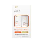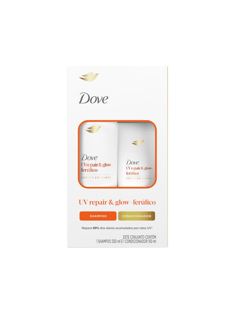 O Kit Dove UV Repair Glow + Ferúlico reúne o shampoo 350ml e o condicionador 150ml para proporcionar uma rotina completa de cuidados capilares com foco na reparação dos danos causados pelo sol. Com ativos como Ferúlico, Niacinamida e Vitamina E, a linha oferece ação antioxidante, brilho intenso e proteção contra agressões externas.