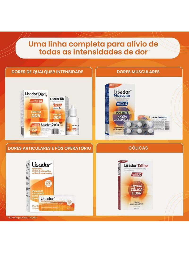 Lisador Dip é um medicamento à base de dipirona, utilizado no tratamento da dor e febre. Tempo médio de início de ação: 30 a 60 minutos após a administração e geralmente duram aproximadamente 4 horas.