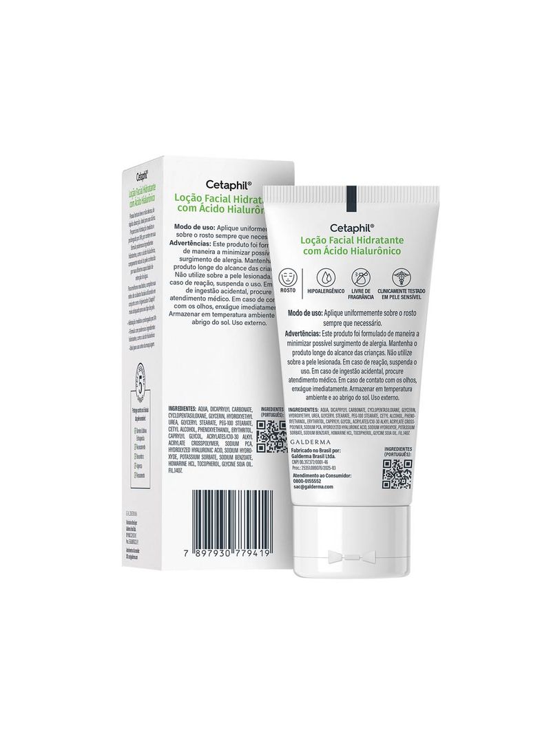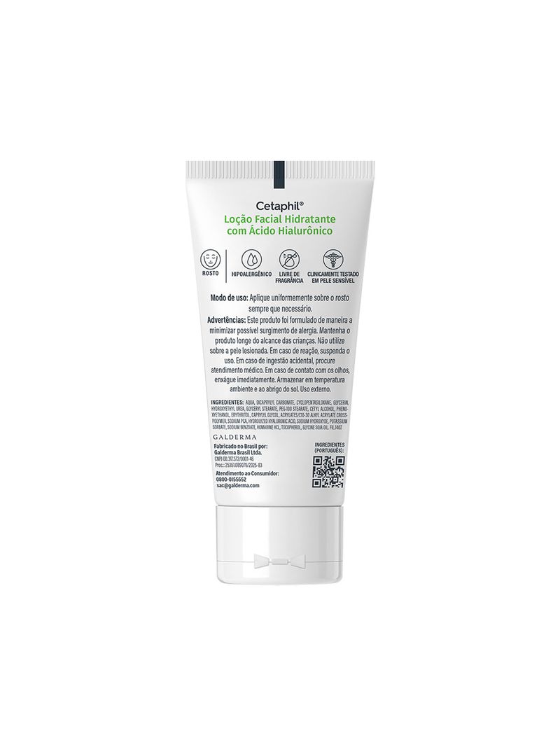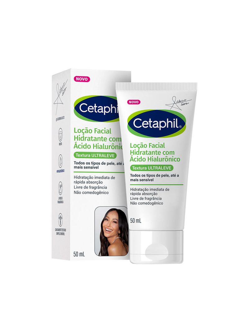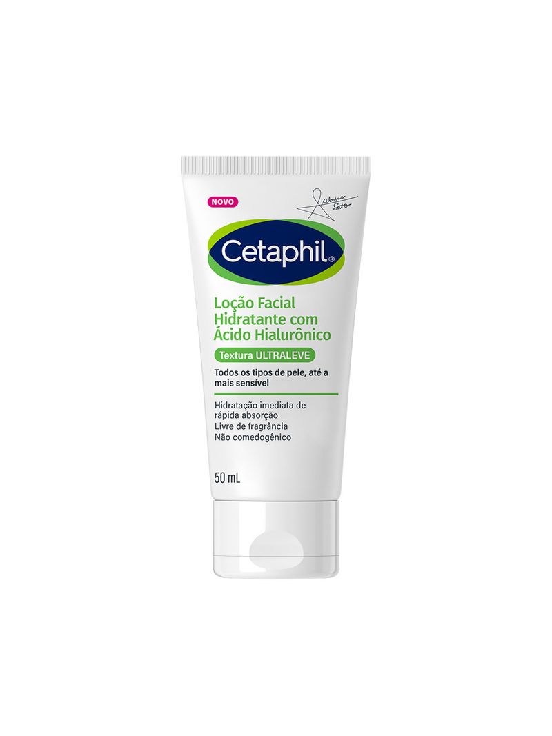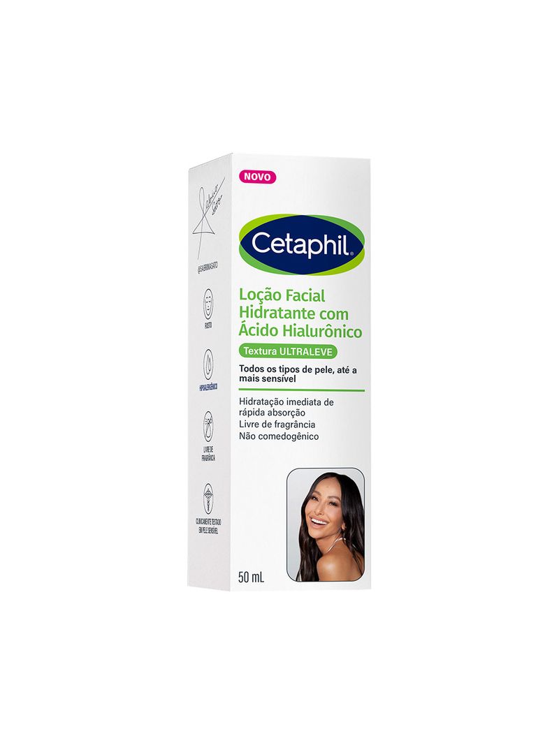 A Cetaphil Loção Hidratante Facial com Ácido Hialurônico é um hidratante leve e de rápida absorção, indicado para todos os tipos de pele, incluindo as sensíveis, que fornece hidratação e revitalização. O produto contém o ácido hialurônico Hyacare® 50, que ajuda a hidratar a pele e a melhorar sua textura, sendo ideal para o uso diário. A embalagem de 50mL é um tamanho compacto, útil para viagens, e a loção protege contra os cinco sinais da pele sensível.