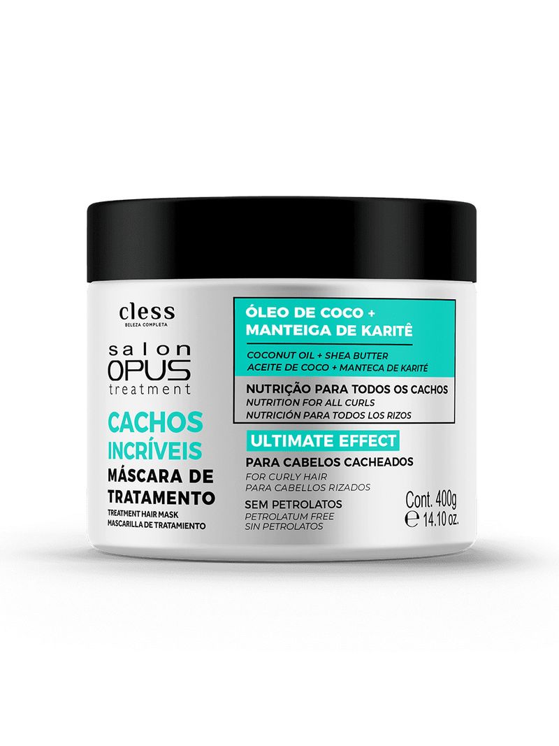 A Máscara de Tratamento Salon Opus Cachos Incríveis trata, hidrata, repara, define e flexibiliza os fios. Ideal para cabelos ondulados e cacheados, sua fórmula nutritiva e hidratante, regenera profundamente os fios, fecha as cutículas e recupera as fibras capilares. Tratamento que condiciona e devolve os nutrientes essenciais, selando os fios, nutre e hidrata sem pesar, proporcionando flexibilidade e brilho, facilitando o penteado. Seus cachos serão incríveis, bem definidos, modelados, soltos e hidratados.