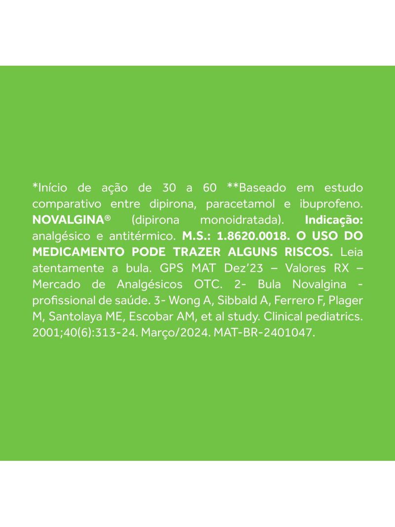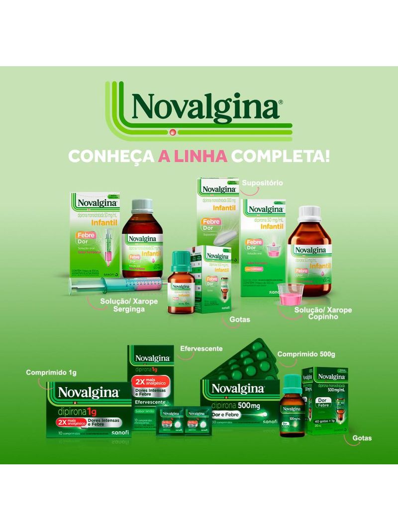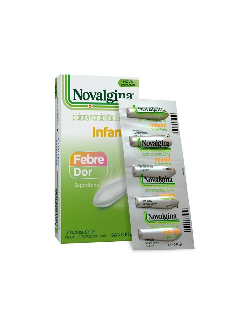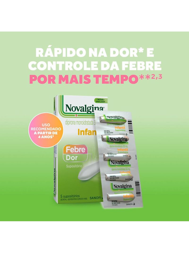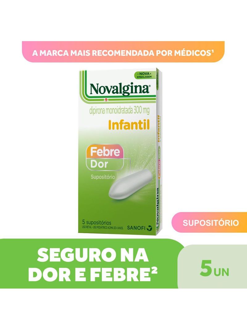 Seguro e eficaz para todos os níveis de febre, das mais baixas às mais altas¹²³**, Novalgina tem em sua composição 300mg de dipirona monoidratada. Ideal para crianças com dificuldade de ingerir medicamentos via oral e pode ser encontrado em caixas com 5 supositórios, sendo indicado para crianças acima dos 4 anos¹.