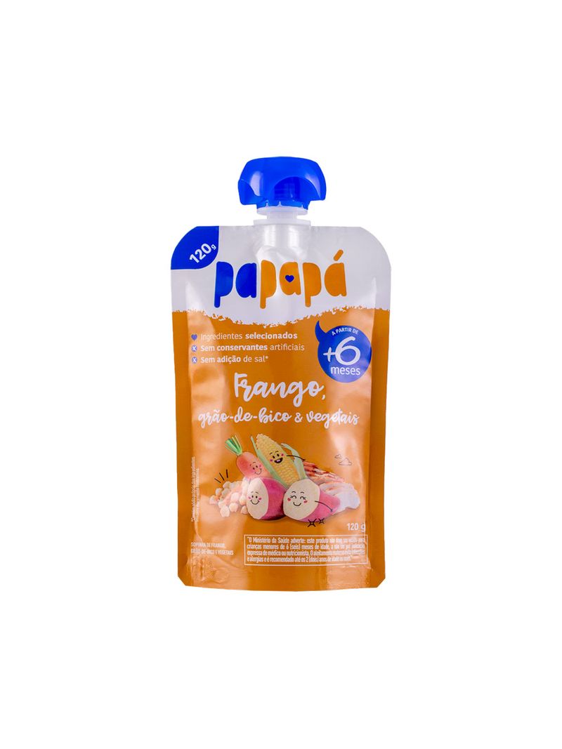 A Papinha Papapá de Frango, Grão-de-bico e Vegetais é uma refeição completa que contém os 4 principais grupos de alimentos, de textura cremosa e ideal para consumo por bebês após os 6 meses de idade. É totalmente livre de conservantes, corantes e aromatizantes e não conta com sal adicionado.Prática e moderna, pode ser oferecida em temperatura ambiente ou pode ser aquecida, além de estimular a autonomia do bebê, pois sua embalagem pouch possibilita que o produto seja consumido com as próprias mãos.