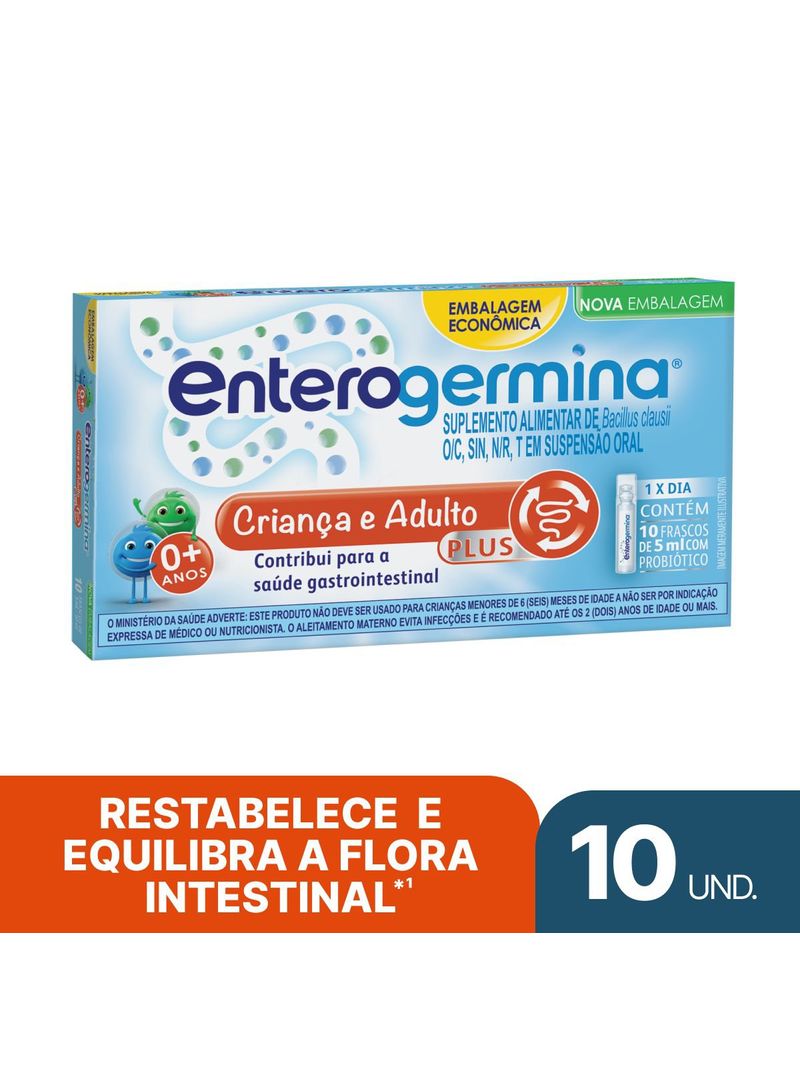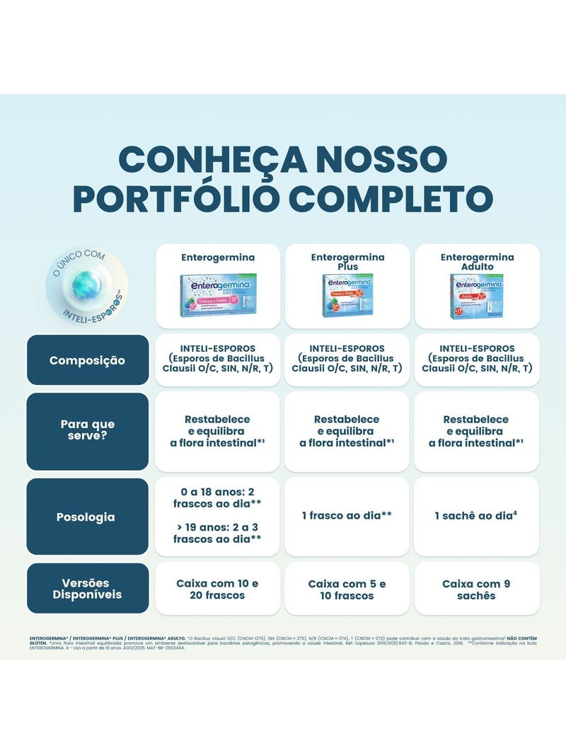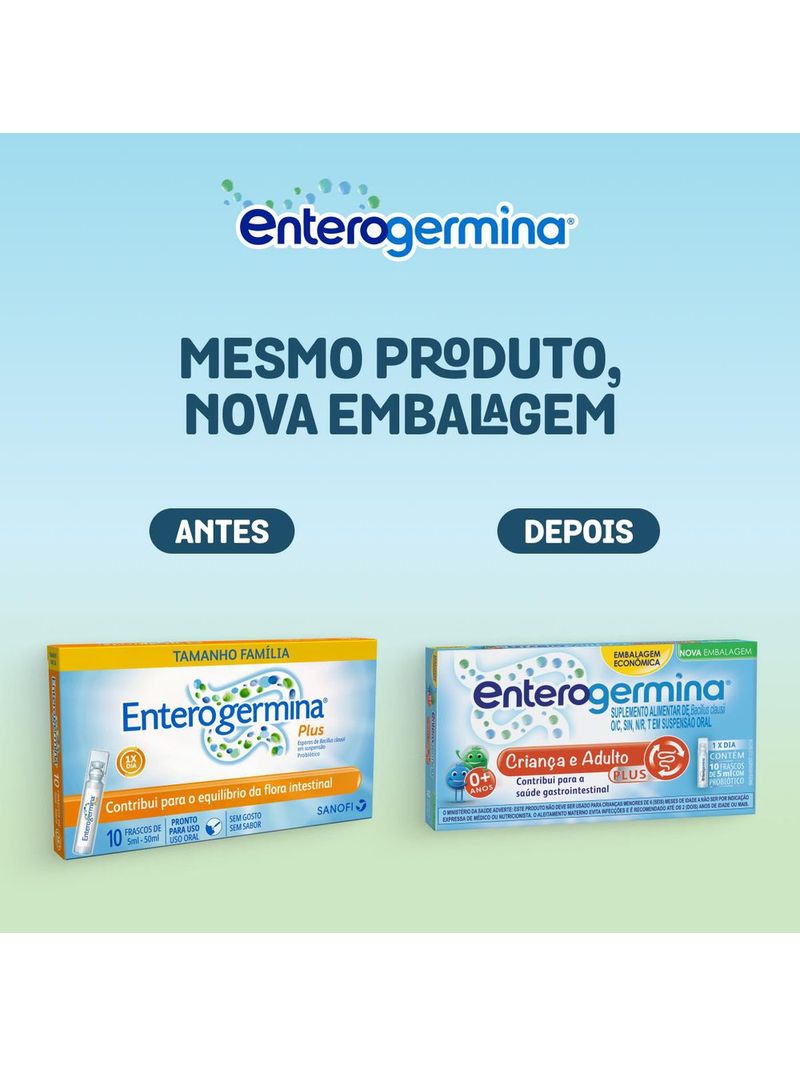 Disponível nas versões com 5 e 10 frascos, Enterogermina Plus possui formato de flaconete de 5ml, composto por água e cerca de 4 bilhões de esporos de Bacillus clausii. O probiótico vem pronto para consumo, é fácil de tomar e levar, não tem sabor, cheiro, corantes, lactose ou glúten e pode ser utilizado por toda a família¹.