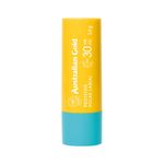 Australian Gold Sunscreen SPF30 Lip Balm Bálsamo tem uma textura fundente em stick, com filtros UV elevados, cera de abelha, óleo de girassol, óleo de oliva e manteiga de cacau para uma nutrição intensa, protetora, antioxidante e suavizante.
