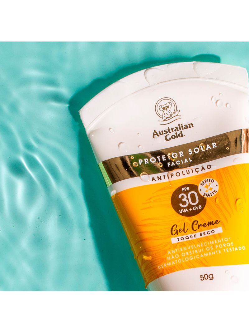 Protetor solar facial Australian Gold Antipoluição com acabamento matte, promove alta proteção contra poluição, raios UVA/UVB e envelhecimento precoce da pele. Indicado para todos os tipos de pele.