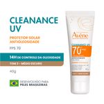 Avène Cleanance Protetor Solar Facial UV Antioleosidade FPS 70 Tom 3 Médio Escuro 40g é o primeiro protetor solar da linha com tecnologia oil-block que garante o controle de oleosidade e brilho por até 14 horas. Sua fórmula avançada oferece muito alta proteção solar FPS 70 e um toque de cor que se adapta perfeitamente a peles de tom médio escuro.