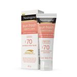 NEUTROGENA SUN FRESH® Derm Care Dry Skin Facial FPS 70 possui textura levinha e hidratante que não derrete. A exclusiva tecnologia HELIOPLEX® XP oferece muito alta proteção ampla e eficaz contra os raios UVA, UVB e ajuda a proteger contra a luz visível. Com ativos ricos em propriedades hidratantes que deixam a pele macia, aveludada e preenchida. Complexo antioxidante rejuvenescedor formado por Niacinamida, Feverfew e Vitamina C. Melhora a firmeza e elasticidade da pele, possui textura não oleosa. Dermatologicamente testado e adequado para a pele sensível.