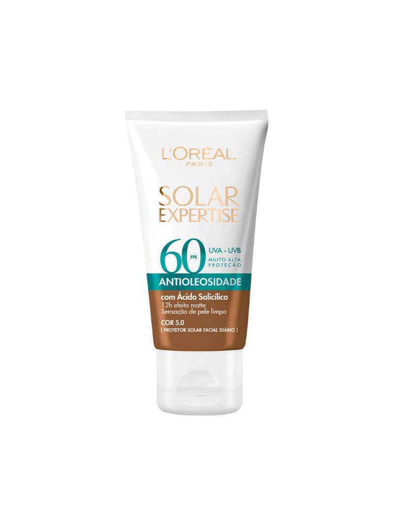 Protetor Solar Facial que combina alta proteção UV e Ćcido SalicĆlico que ajuda a controlar a oleosidade, para uma sensação de pele limpa com 12h de efeito matte. Fórmula enriquecida com Ćcido SalicĆlico, ativo muito utilizado por dermatologistas para reduzir o excesso de oleosidade. Auxilia, assim, no controle da oleosidade e reduz sinais da pele oleosa, reduzindo e desobstruindo poros. COR 5.0 - com uma leve cobertura cor de base, se adapta a diversos tons de pele. Uniformiza o tom e disfarƧa imperfeiƧƵes imediatamente, com um acabamento natural.