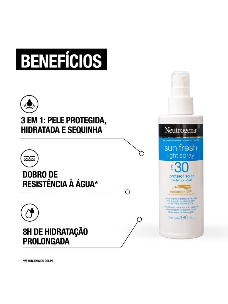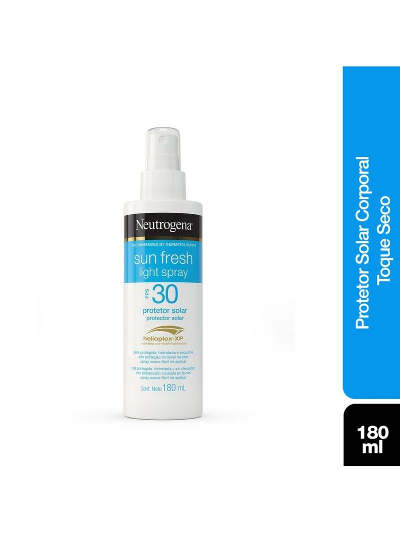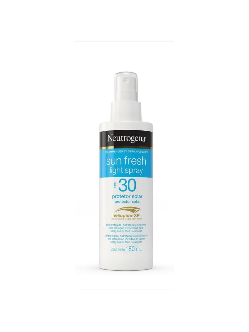 Neutrogena Sun Fresh Light Spray FPS 30- Previne fotoenvelhecimento e manchas causadas pelo sol- Hidratação o dia todo- Rápida absorção. Oil free- Muito resistente à água e ao suor- Não deixa resíduo branco na pele