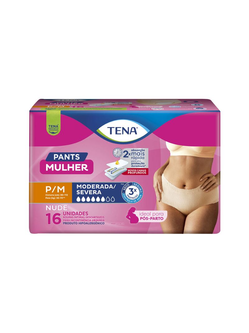 A TENA Pants Mulher Nude PM foi criada especialmente para mulheres que desejam proteção, conforto e discrição no dia a dia. Com design anatÓmico e cor nude, se ajusta perfeitamente ao corpo feminino, proporcionando discrição sob a roupa. Possui núcleo superabsorvente, barreiras antivazamento, controle de odor e material respirÔvel, garantindo pele seca e sensação de frescor por mais tempo. Ideal para mulheres com incontinência urinÔria moderada a intensa, podendo ser usada de forma segura durante o dia ou à noite.