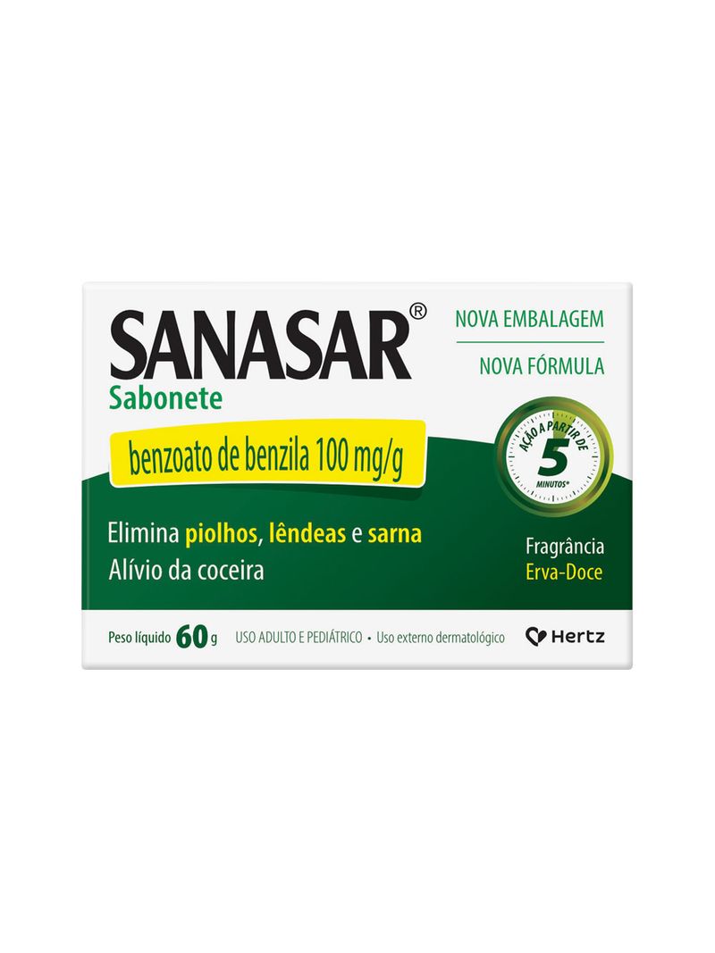 Sanasar Sabonete é seguro e eficaz no trato de doenças parasitárias como a Escabiose (piolhos e lêndeas) e Pediculose (sarna humana), proporcionando alívio rápido da coceira e dos sintomas relacionados à infecção dos parasitas. Formulado com Benzoato de Benzila que apresenta eficácia comprovada de 100% após uma única aplicação em até 24h e após três semanas de acompanhamento. Uso adulto e pediátrico. Contém 60g.