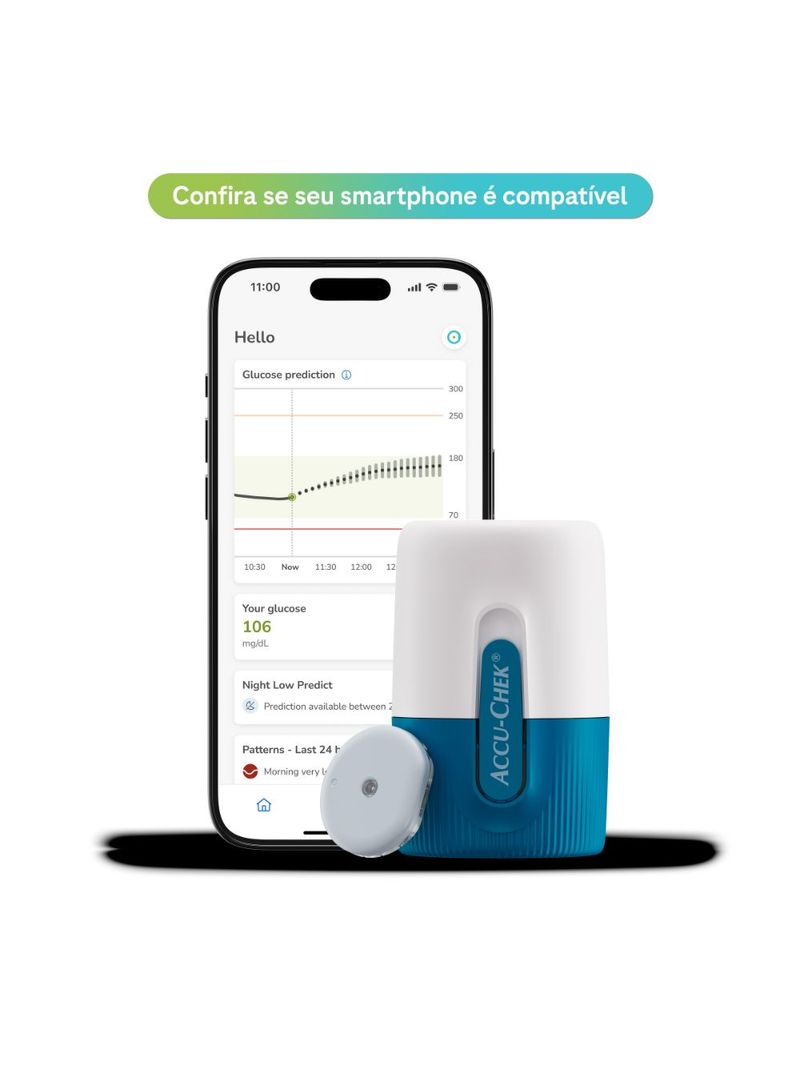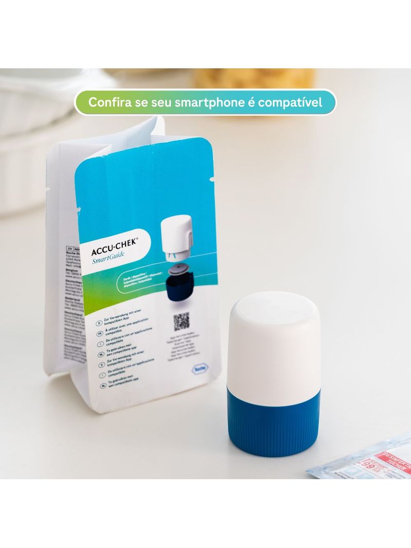 *A calibração com uma leitura de glicemia capilar pode ser solicitada pelo aplicativo.Produto destinado a maiores de 18 anos.* Se os seus sintomas não corresponderem às leituras do sensor, realize um teste de pontade dedo e consulte seu profissional de saúdeEspecificações Técnicas e CompatibilidadeEmbalagem Contém:- 1 Dispositivo Accu-Chek SmartGuide (que inclui o aplicador com o sensor já integrado em uma única peça).