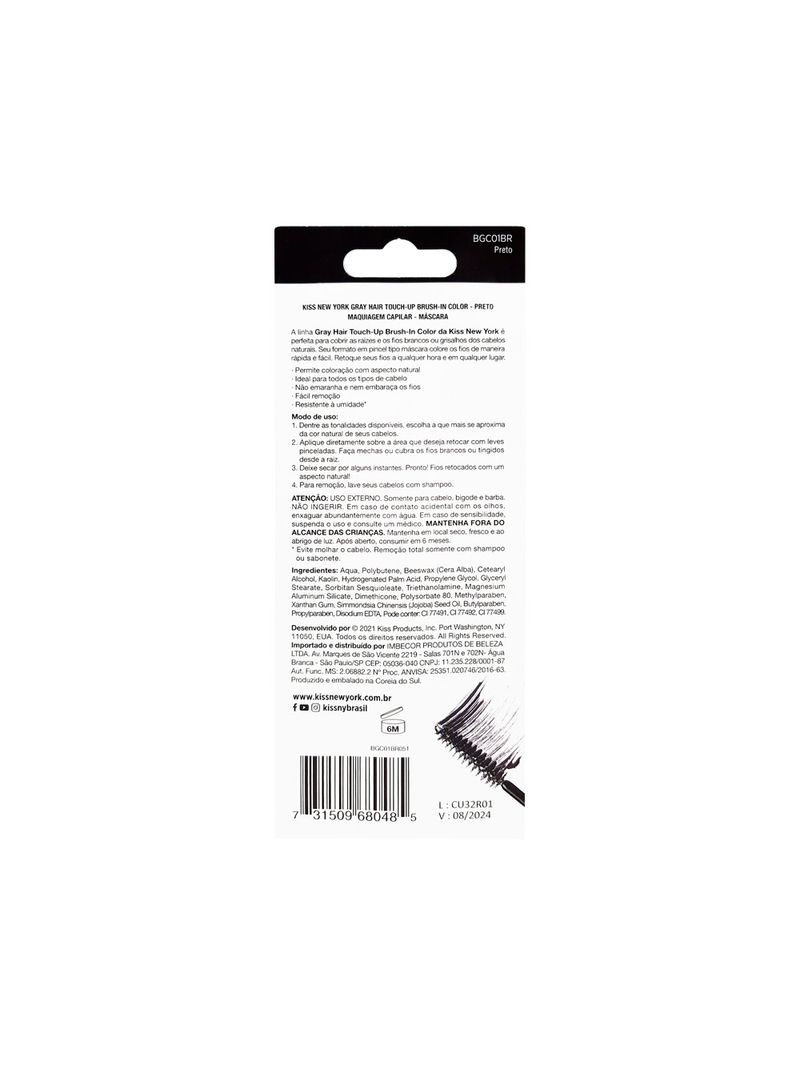 A Máscara de Retoque Capilar Brush-In é o produto perfeito para um retoque instantâneo e eficiente dos fios brancos. Seu pincel extra-grande desliza com facilidade e garante uma cobertura detalhada e eficaz, pois retoca fio a fio de forma prática e com resultado natural mesmo em áreas maiores. Com qualidade comprovada Kiss NY, a máscara de retoque capilar é formulada com Óleo de Jojoba, contribuindo também para a hidratação e restauração dos fios. Além de prática na hora de usar, a remoção também é bem fácil: basta usar água em shampoo. O produto também pode ser utilizado nos pelos da barba e do bigode.