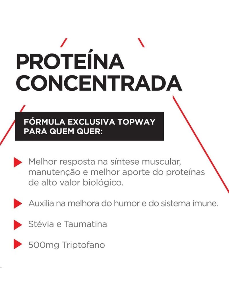 O melhor produto, com a melhor tabela nutricional! Com 100% WHEY TOPWAY você tem a proteína concentrada do soro do leite em uma fórmula exclusiva com a associação de vitamina D e vitamina B12, que auxiliam na melhoram a imunidade, humor e estimulam a taxa de síntese proteica. É inovação com ativos naturais e vitaminas na dosagem ideal para quem busca resultados. Adoçado com stevia e taumatina.