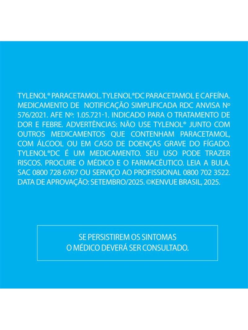 TYLENOL PARACETAMOL E CAFEÍNA. INDICADO PARA O TRATAMENTO DE DOR E FEBRE. ADVERTÊNCIAS: TYLENOL DC É UM MEDICAMENTO. SEU USO PODE TRAZER RISCOS. PROCURE O MÉDICO E O FARMACÊUTICO. LEIA A BULA. MS- 1.1236.3426. SAC 0800 701 1851 OU SERVIÇO AO PROFISSIONAL 0800 702 3522. DATA DE VEICULAÇÃO: MAI/23. JOHNSON & JOHNSON DO BRASIL INDÚSTRIA E COMÉRCIO DE PRODUTOS PARA SAÚDE LTDA - 2023. SE PERSISTIREM OS SINTOMAS O MÉDICO DEVERÁ SER CONSULTADO.