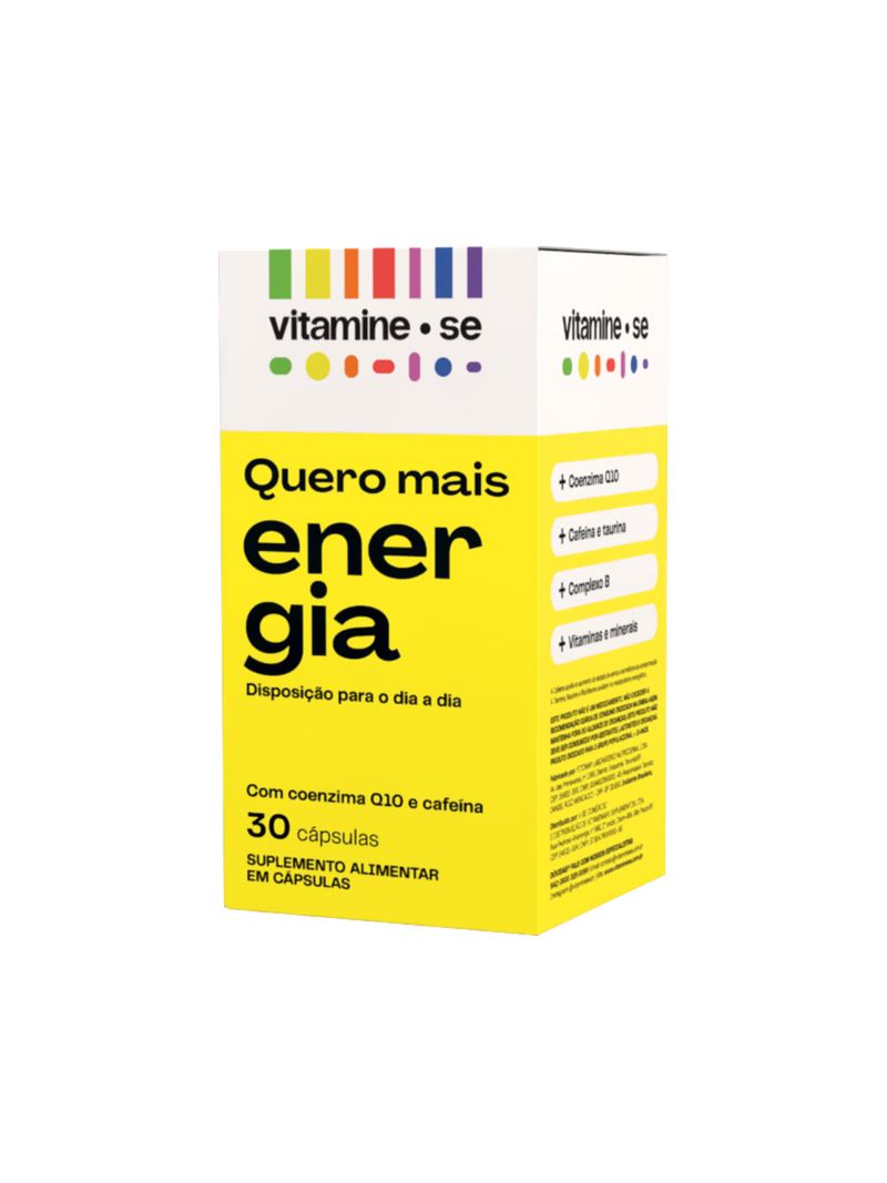 Vitamine-se Quero Energia é um suplemento alimentar desenvolvido para fornecer mais energia e disposição ao longo do dia. Sua fórmula contém Coenzima Q10, Cafeína, Taurina, Tirosina e 9 vitaminas e minerais, que auxiliam no metabolismo energético, no desempenho físico e na redução da fadiga mental e física.